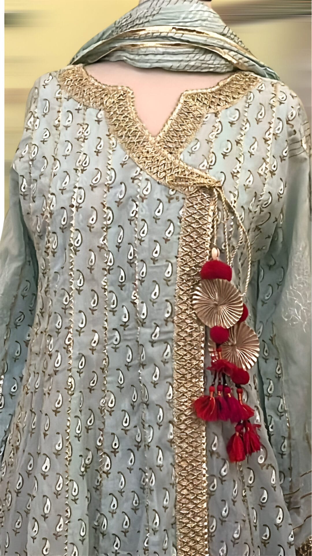 Kaali Dar Ankarli Experience the beauty of block printing fused with intricate Gota work detailing. Each garment boasts multiple panels and a meticulously crafted neckline embellished with handmade red tassels. Paired with Cheent print wide leg gotta work pants. Eid ensemble with sophistication and charm.