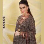 Ajrak Chevron hand block printed silhouette in Hyderabadi neckline with heavy detailing of zardosi,tilla, gotta, sequins, beads, dabka and diamonties. paired with straight pants and duppata is finished with banarsi borders, laces and gotta.