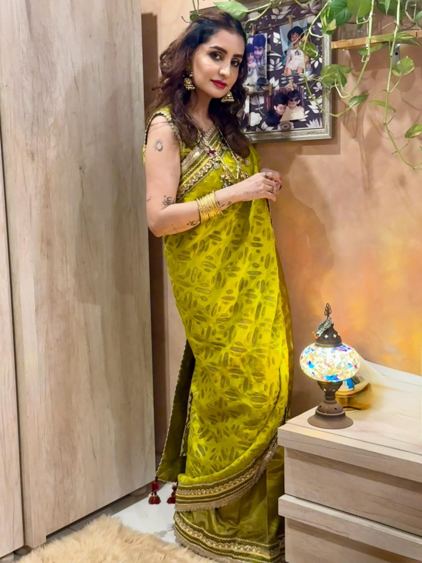 A rich Dhani green canvas brought alive with handmade and handcrafted Rilli work. This saree blends the freshness of nature with timeless artisanal detailing, making it a true heritage piece.