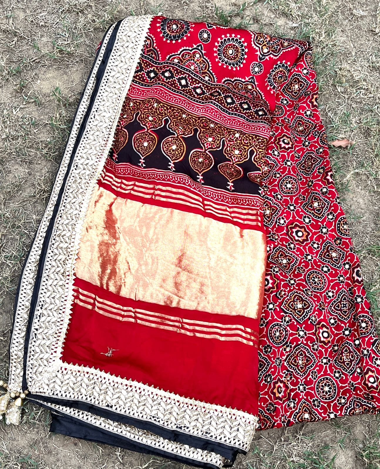 Presenting our Ajrak Chunri Kamdani Work Dupatta in pure Gajji silk—a masterpiece of tradition and craftsmanship! This stunning dupatta is adorned with Kamdani work four sides finished borders and tassels.