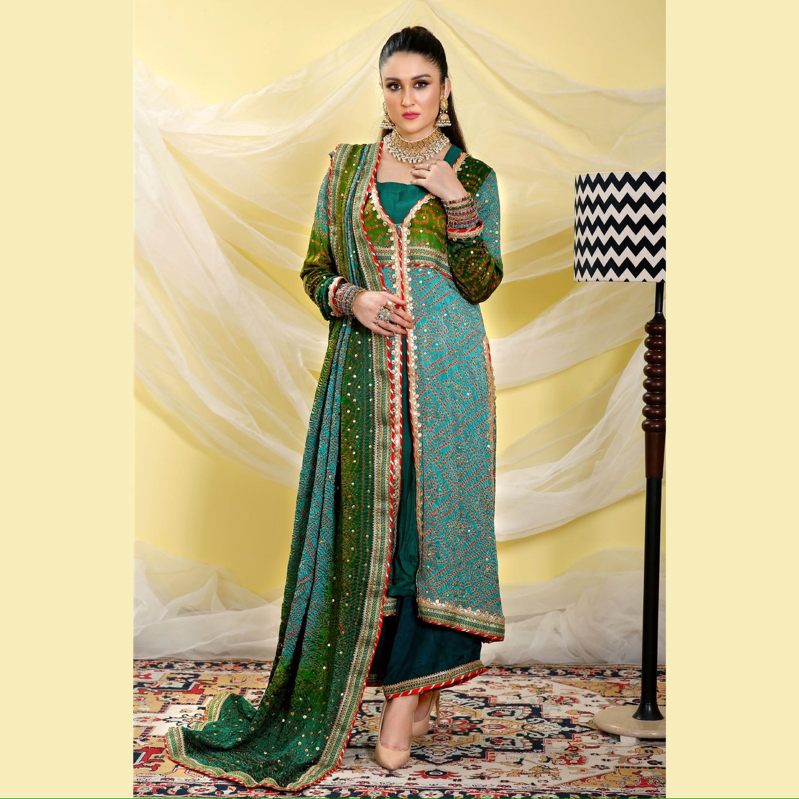 light & dark ombré shade of green silk Chunri outfit, featuring Kamdani work,