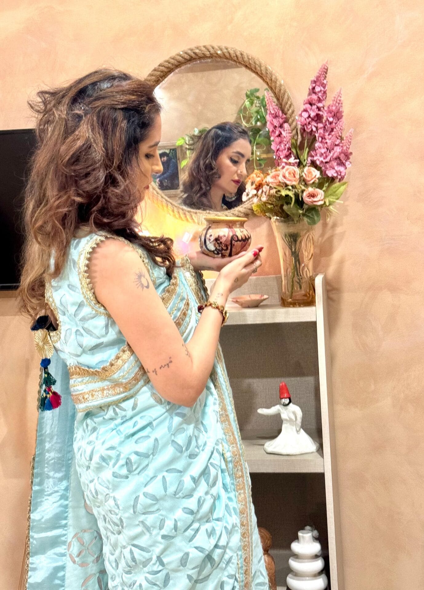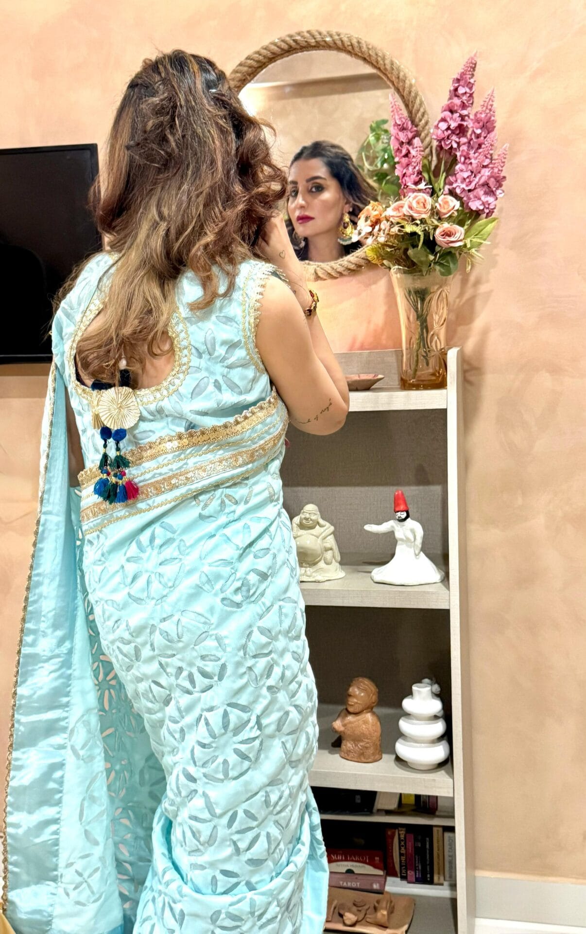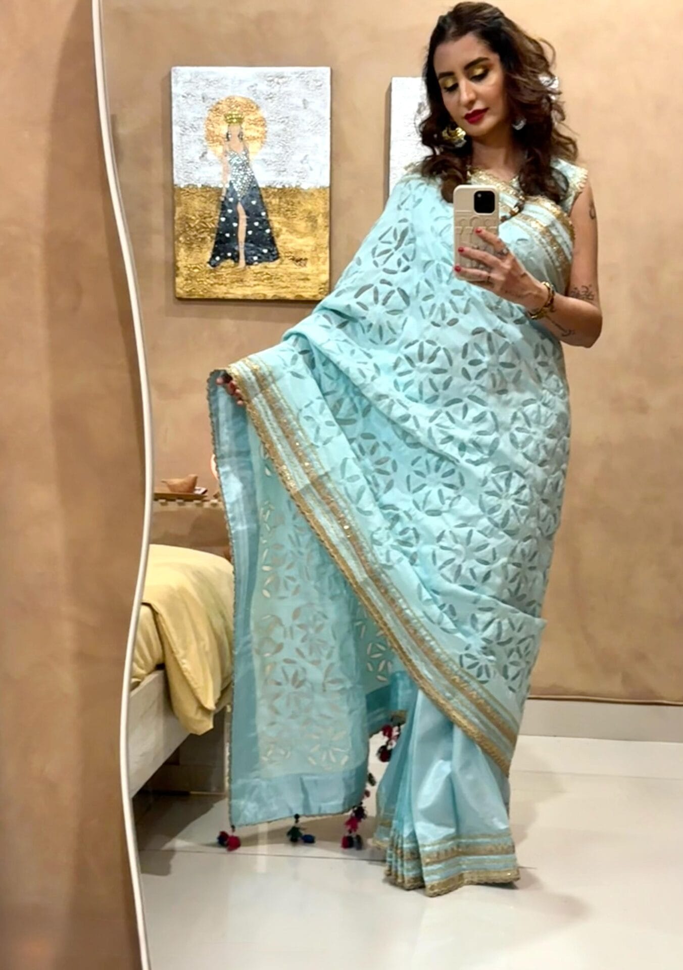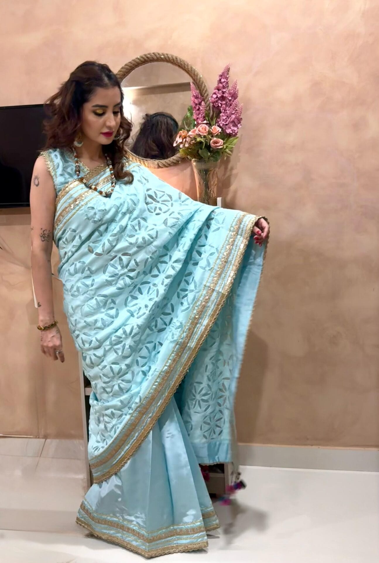 A refreshing Ferozi hue, inspired by the calmness of the sea and elevated with handcrafted Rilli artistry