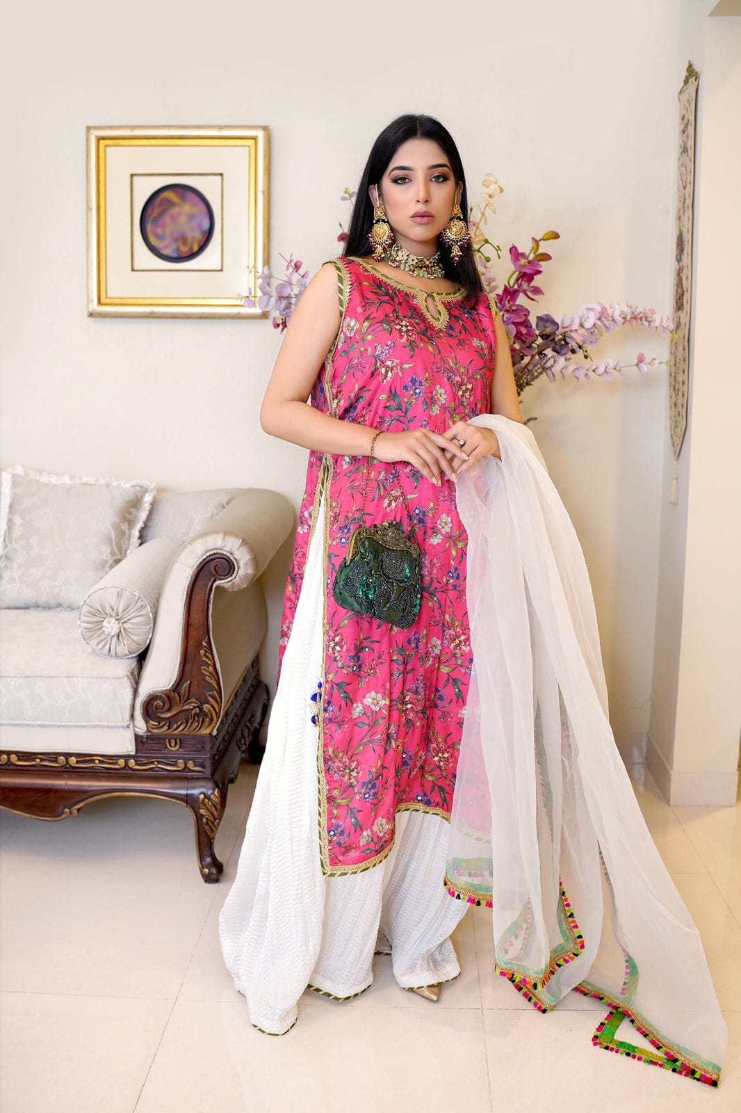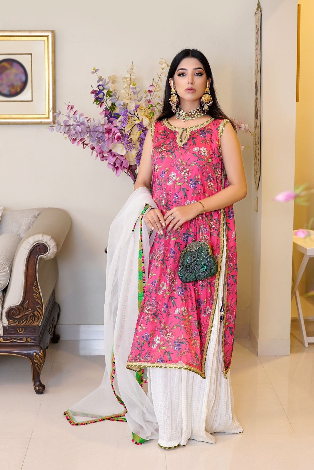 Step into elegance with our Long Floral Double-Layered Shirt, beautifully adorned with hand-touched gotta, sequins, pearls, and diamantes. Paired with a Crushed Silk Skirt, this stunning ensemble is perfect for any festive celebration. Shine bright and make a statement!