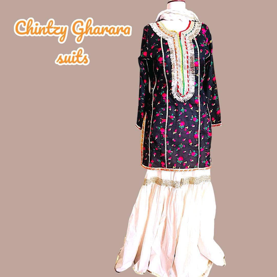 “Introducing our exquisite festive gharara collection featuring vintage Cheent prints, embellished with intricate gotta work and adorned with handmade tassels! Elevate your celebrations with these timeless pieces that blend heritage and craftsmanship effortlessly. ✨🌟